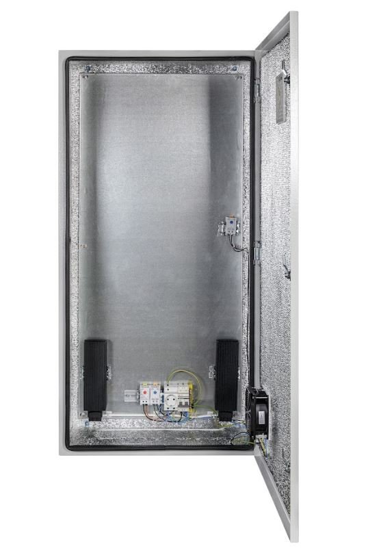 Навесной климатический шкаф с монтажной платой оснащен пятью гермовводами типа MG-25. Внутренние размеры шкафа составляют 577х1177х270 мм (ширина х высота х глубина). Шкаф соответствует стандарту защиты IP54 и способен функционировать в температурном диапазоне от -55 до +50°С.