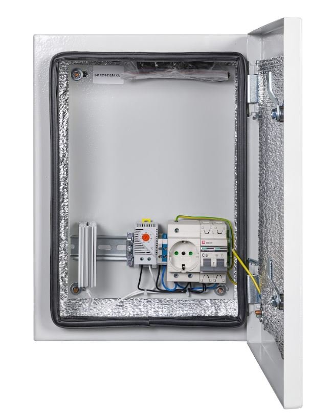 Навесной климатический шкаф с монтажной плитой оснащен двумя гермовводами MG-25. Внутренние размеры шкафа составляют 277х377х120 мм (ширинахвысотахглубина). Шкаф соответствует степени защиты IP66 и способен функционировать в температурном диапазоне от -55 до +50°C.